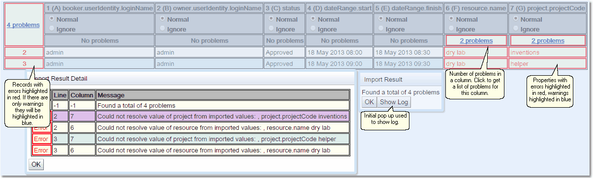 If there are problems a pop up will appear use the Show Log button to show a complete list of the problems. Records with an error will have their record number highlighted in red as will those property values which are causing an error. If a record has only warnings it will highlighted in blue, as will those property values which are just warnings. Moving the cursor over a property with an error/warning will result in a tool tip describing the error/warning. Also for each column you can see the number of problems. If there are any problems in a column clicking on the number of problem text will produce a pop up which will show the problems for just that column.