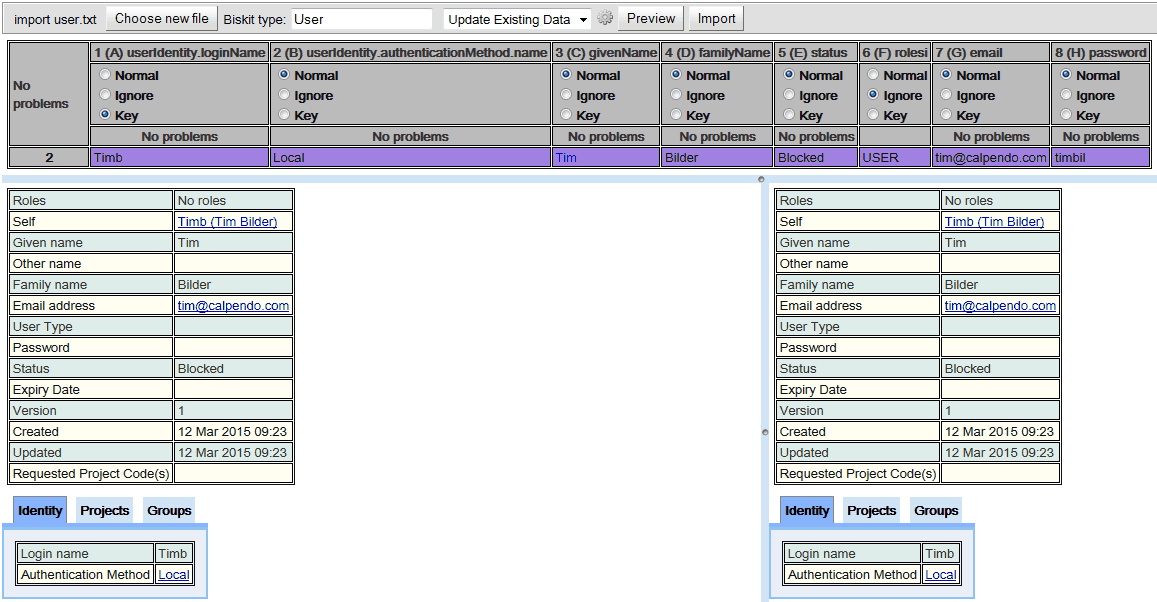 In this example for importing User data, the key is specified to be the combination of userIdentity.loginName and userIdentity.authenticationMethod.name, as the combination of these two will be unique.