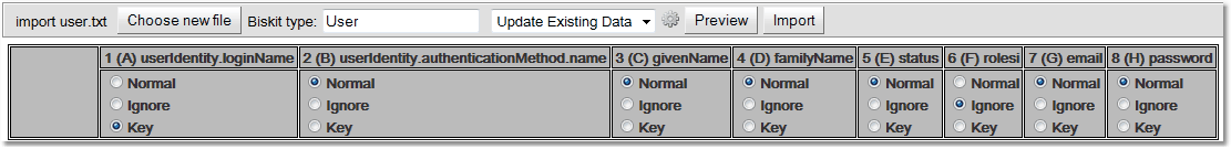 At this point decide whether to choose to Update Existing Data or Insert New data. If updating data then import needs to know which columns to use as the key fields to find the appropriate records to update. Click on the Key option below the column headings of those properties that are keys fields or put Key: before the property name in the file.