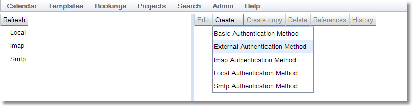 For a complete description of the standard toolbar buttons read the Toolbar Button Standard Definition chapter. The only difference from the standard is that when the Create button is clicked a drop down menu appears to allow the administrator to choose which type of Authentication Method to be created.