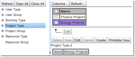 Types and Groups appear slightly differently, Types are just a list of the properties that can be changed. A group has that list but also a list of all the appropriate items that are in its group. For instance a User Group will have a list of all the logins associated with that group.