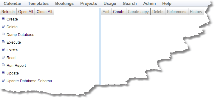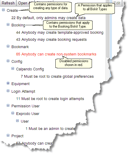 Once all the items in the tree are viewable, the Permissions are viewable in their Action, Biskit Type, Permission categorisation with any that are disabled shown in red.
