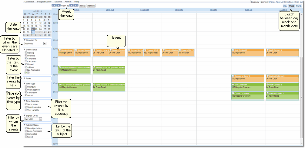 When Exprodo SDM is first started, it opens at the Events Calendar showing a week of events.