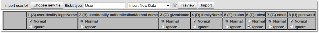 In this example for importing User data, Insert New Data. has been chosen, the Key option has disappeared as no longer required.