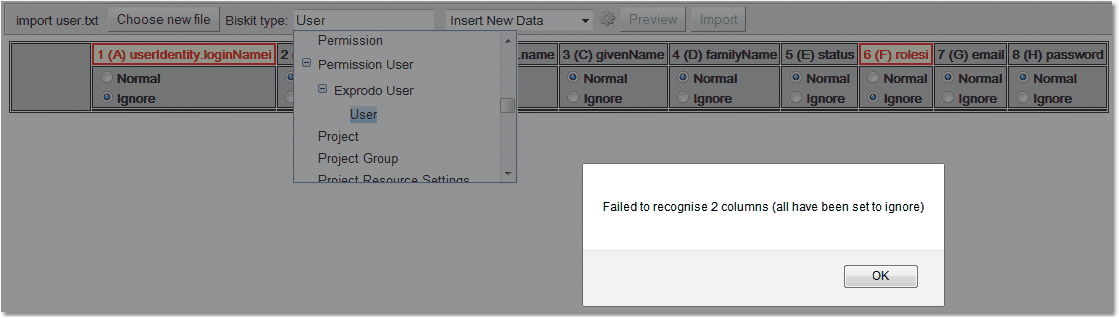Header errors are found when the import file is first loaded using the Send button. Once Import has decided on the Biskit Type being imported or the user has selected the correct Biskit Type, the header information is loaded. If any of the headers cannot be resolved to property names or property labels (in a case insensitive manner if possible) then those headers are marked in red. A pop up will inform the user how many column headings have not been recognised. Import then updates those columns from Normal to Ignore, so the user can proceed with the import without those columns.