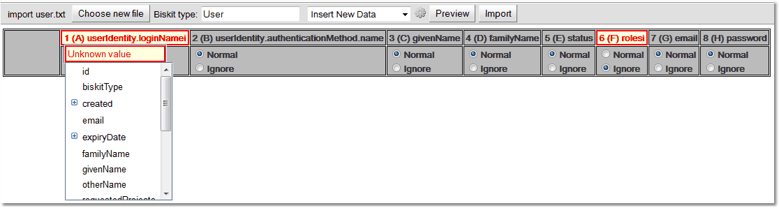 These errors can be fixed in the Import page. Just click on any red header and you will get a drop down box with a complete lists of this Biskit Types properties. Select the correct one, and the error will be removed. Once done the column will be moved from Ignore to automatically.