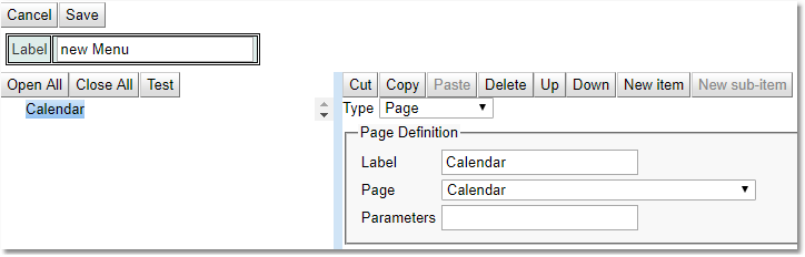 Using the Menu Item Toolbar, press New Item, then in the right pane set up the Type to be Page, and for the Page Definition set Label to Calendar and Page to Calendar. This will create the first menu item.