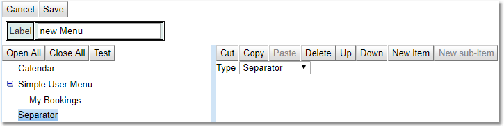Click on Simple User Menu then using the Menu Item Toolbar, press New Item, then in the right pane set up the Type to be Separator. This creates a simple separator to which is a line across the menu to split the menu into sections.