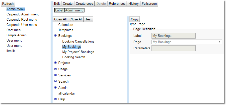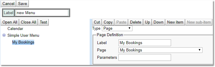 Using the Menu Item Toolbar, press New Sub Item, then in the right pane set up the Type to be Page, and for the Page Definition set Label to My Bookings and Page to My Bookings. This will put an item on the Simple User Menu sub menu.